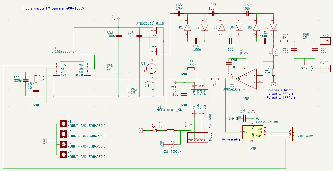 These pulses are then fed into a three-stage voltage multiplier, providing an overall multiplication factor of approximately six. The feedback loop that regulates the output voltage is implemented using a 100 MΩ / 310 kΩ divider connected to the multiplier output, before the HV RC-RC filter (1 MΩ and 33 nF). The divided-down voltage is buffered by an AD8541 operational amplifier to provide enough drive capability for the next stage: a programmable voltage divider based on the MCP41010.